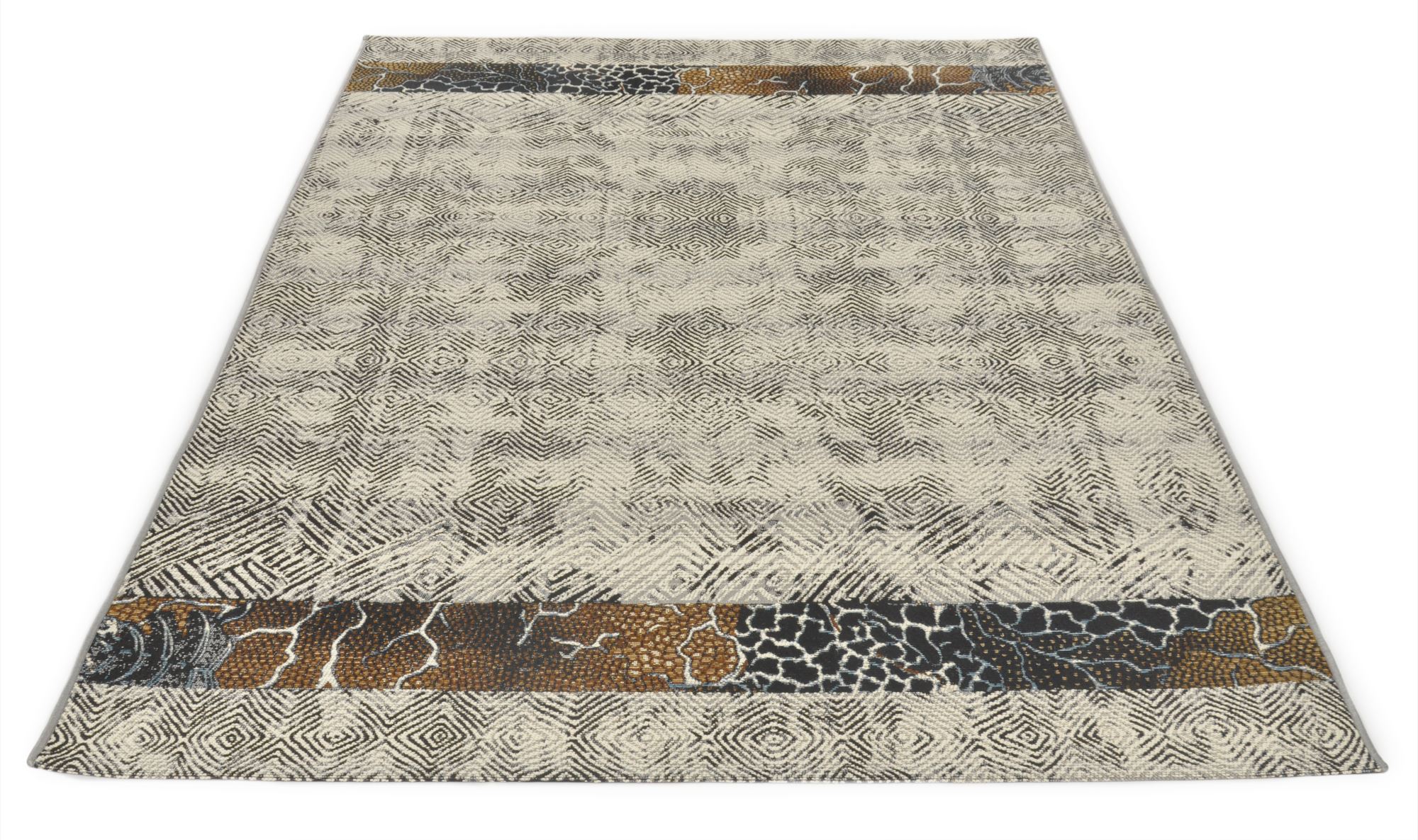Dieser wunderschöne Webteppich zeigt sich in einem abstrakten Muster. Die unterschiedlichen Tierfellmuster und afrikanischen Muster sind wild und frei angeordnet und verbinden sich zu einem komplexen außergewöhnlichen Gesamtbild. Die ineinander verschwindenden Muster wirken mystisch und geheimnisvoll und nehmen uns mit auf eine spannende Reise. Die Verschmelzung von Ethno Look und Vintage-Stil sorgen bei diesem Design für eine unvergleichbare Ausstrahlung und vermitteln Behaglichkeit und Ruhe. Das warme intensive Farbspektrum bewegt sich im erdigen bis rötlichen Farbbereich und erfährt durch die optische Used Look Verwaschung des Vintage Looks eine Modernität, die jeden Boden zum Leben erweckt. . Zwei breite Streifen am Ende des Teppichs stechen mit Farbintensität hervor. Hergestellt aus hochwertigem schadstoffgeprüftem Polypropylen und Polyester Fasern hält dieses kurze Flachgewebe auch der größten Beanspruchung stand und erfreut Sie jahrelang mit einem makellosen Aussehen. Die verwendeten sehr widerstandsfähigen Synthetik Fasern bringen noch weitere hervorragende Nutzungseigenschaften mit sich, wie die Feuchtigkeits- und UV-Strahlen Resistenz. Diese Kombination von Material und Nutzungseigenschaften macht diesen Teppich zu einem einzigartigen Allrounder in ihrem Innen- und Outdoor- Wohnbereich. Die meisten Flecken lassen sich leicht mit einem feuchten Tuch entfernen und bei hartnäckigen Flecken greifen Sie einfach zu einem handelsüblichen Teppichschaum. Das verarbeitete Material trocknet bei Nässe schnell wieder aus, ohne sich zu verfärben oder gar abzufärben, was selbstverständlich für die Farbechtheit dieses Produktes steht. Auch in Räumen mit Fußbodenheizung kann dieser Teppich problemlos ausgelegt werden. Dieser exotische Alleskönner im Afrika Look verwandelt ihr Zuhause in einen Treffpunkt von unterschiedlichen kulturellen und traditionellen Mustern und vermittelt Lebensfreude pur. Der perfekte Indoor-und Outdoor Teppich! Bitte beachten Sie, dass die Farben auf Ihrem Monitor von den Original-Farbtönen abweichen können. Wir empfehlen eine rutschhemmende Unterlage.